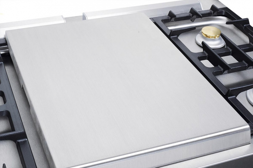 Ce couvercle en inox se pose sur la plaque coup de feu des modèles “Tradition” pour servir de plan de travail.